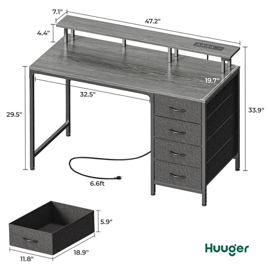 Huuger 47 Inch Computer Desk with Power Outlets and LED Lights, Gaming Desk with 4 Drawers, Office Desk with Monitor Stand, Study Desk Work Desk for Home Office, Small Spaces, Gray