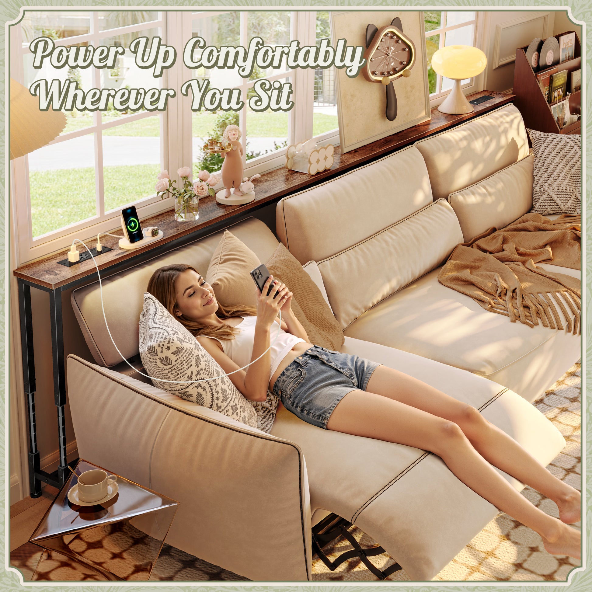- 【2 Built-In Charging Stations】Tired of hunting for an outlet when you’re finally comfortable on the couch? This adjustable narrow console table is designed for real-life lounging. With 2 built-in charging stations (each with 2 AC outlets, 1 USB-A, and 1 USB-C) which can placed in 4 positions, you can charge your iPad, phone, laptop, or controller without getting up—or fighting the couch blocking your wall outlet