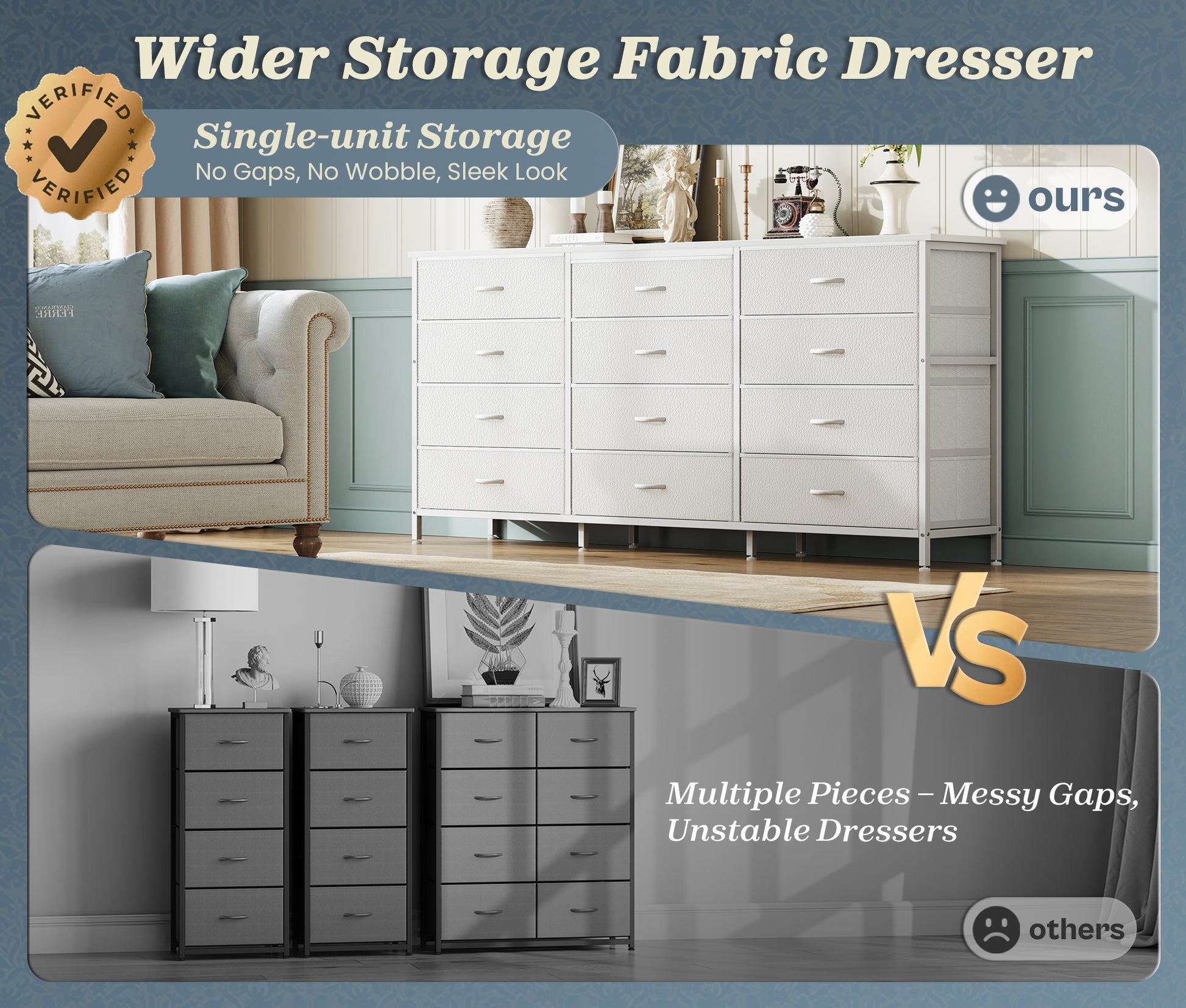 - 【12 Fabric Drawer Dresser】Tired of piles on the floor or overflowing closets? This fabric dresser with 12 spacious drawers give your home the breathing room it deserves. Use drawer 1 for socks, 2 for underwear, 3 for remote controls, 4 for seasonal scarves, and so on, everything is neatly categorized and easy to find with this functional large tall dresser. Perfect for busy families, college students, craft lovers