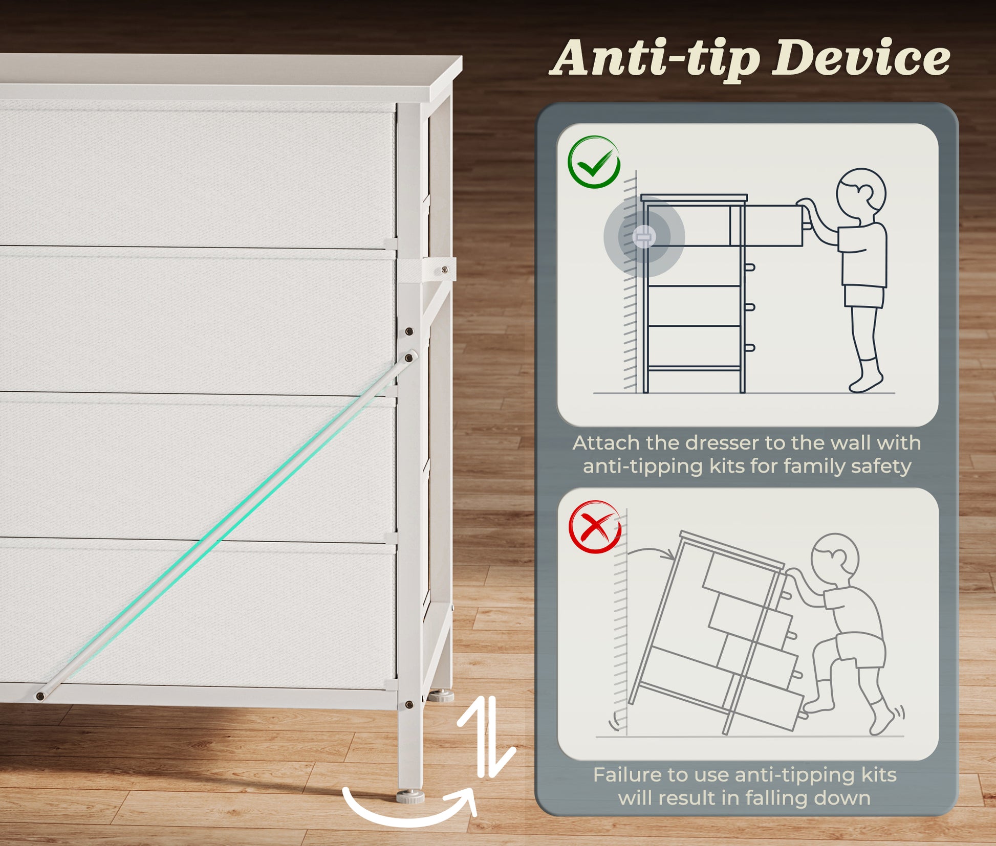 - 【Strong & Stable Structure】Wobbly wide dresser? Not here. Made with a sturdy P2-grade particleboard top and reinforced metal frame, this fabric dresser for bedroom holds your big screen easily. Support bars behind enhance the stability. Adjustable feet keep it steady, even on uneven floors, perfect for different homes
