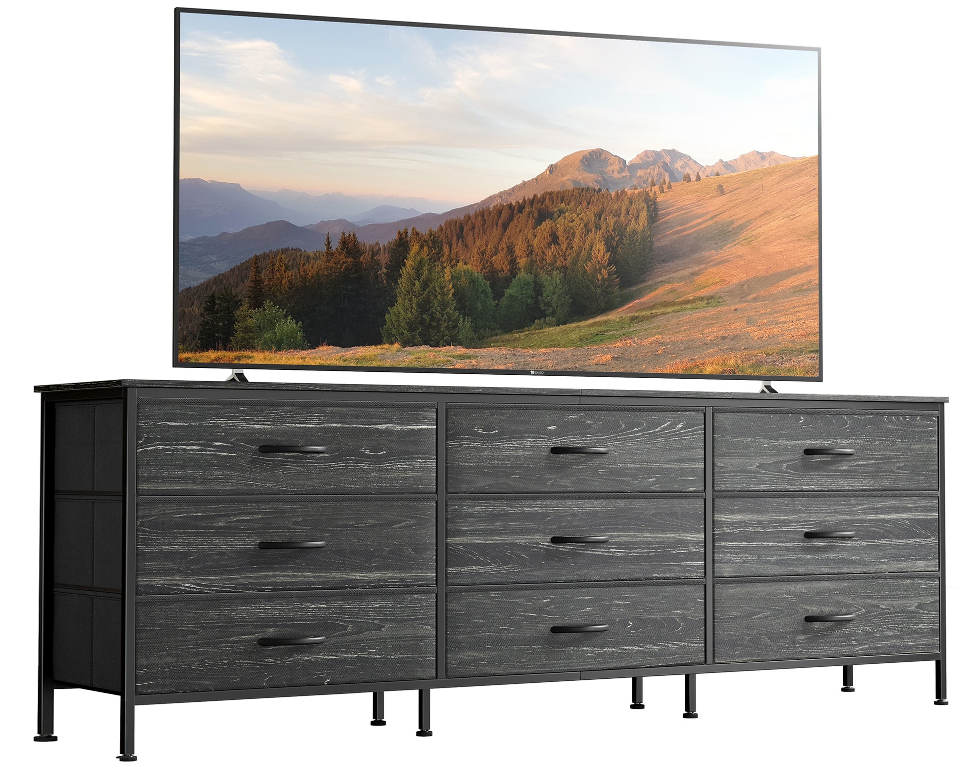- 【Sturdy, Safe and Stable】Crafted from high-quality fabric, a durable wooden top, a robust metal frame and easy-to-pull handles, this dresser TV stand brings longevity while being lightweight to move. Drawers glide smoothly for easy access even to little kids. With anti-tip kits included, it's child-friendly and ensures this clothes dresser stays securely in place. The 8 adjustable feet keep it stable on uneven surfaces and safeguard your floors from scratches