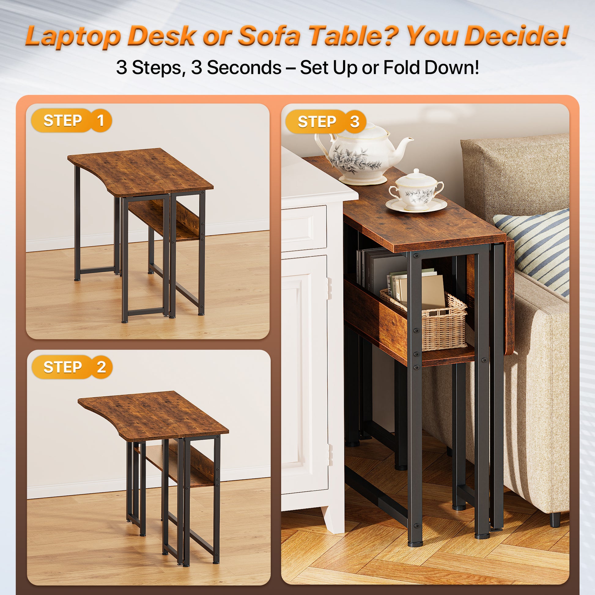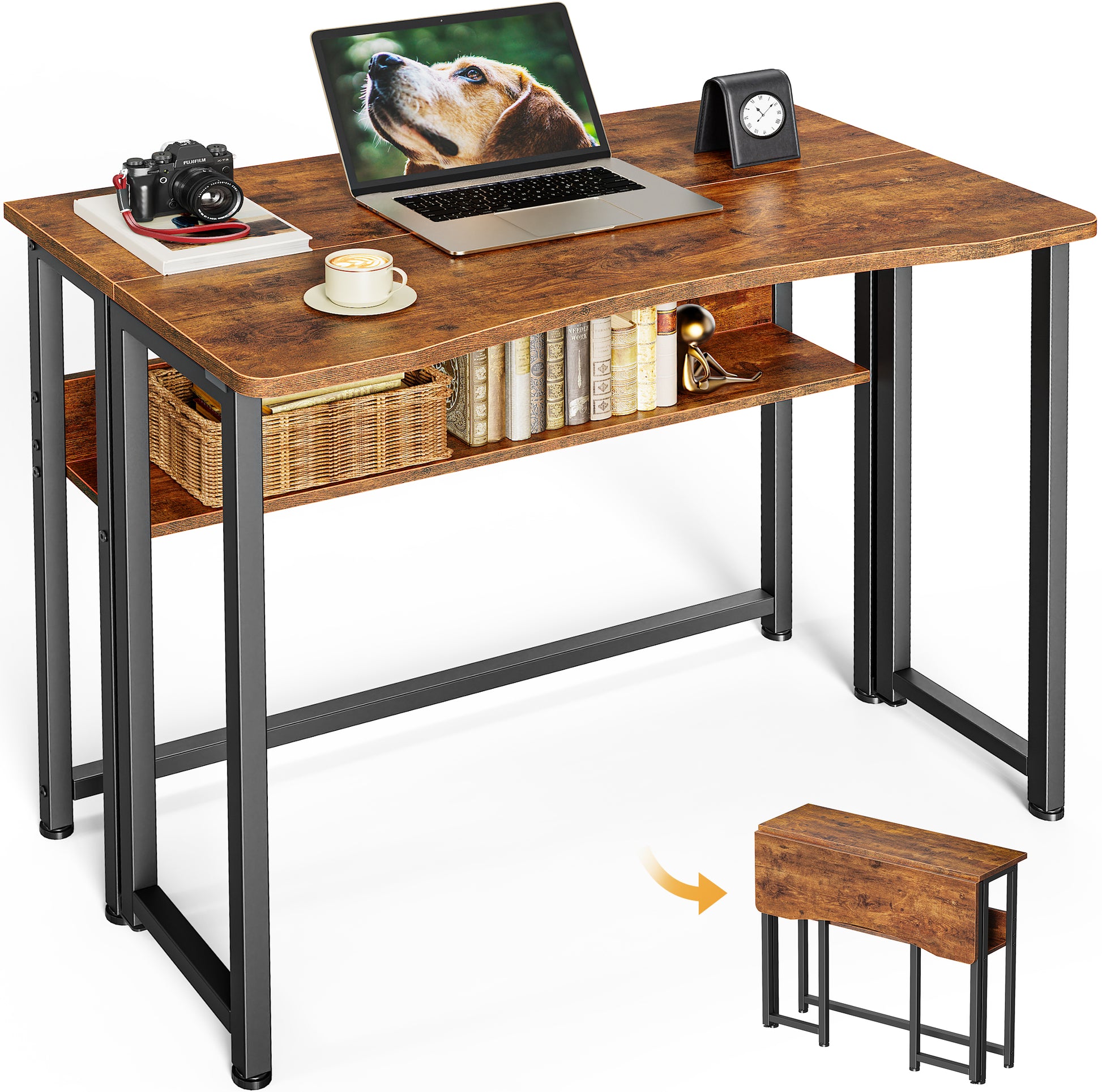 - 【Desk with Storage Shelf】Need both workspace and storage in a small area? This foldable office desk has you covered. The bottom shelf is perfect for storing books, baskets, or work supplies while you’re using it as a desk. When folded, this home office desk transforms into a side table that fits between sofas, ideal for holding drinks, snacks, or your remote