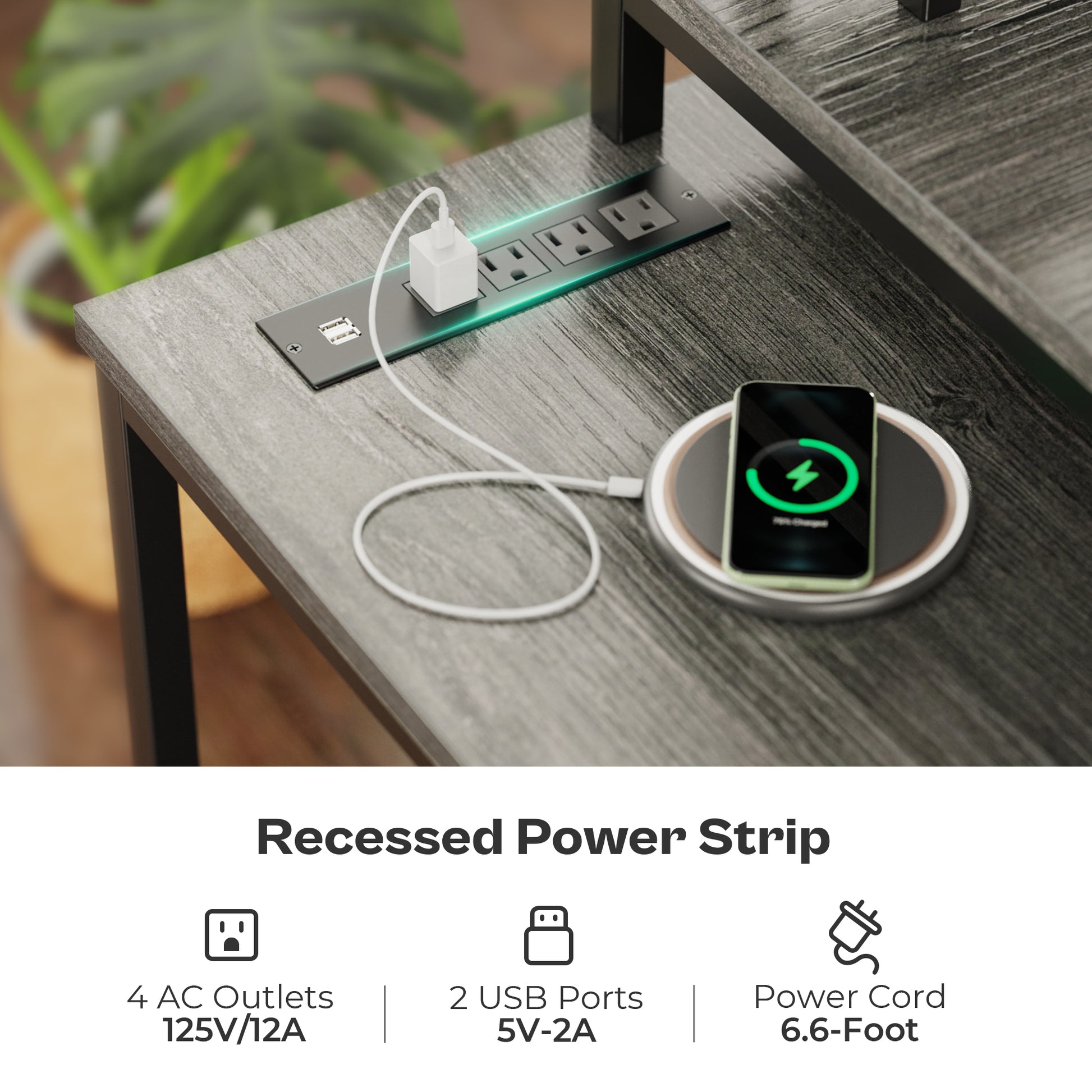 - 【POWER OUTLETS & MONITOR STAND】: 4 AC outlets and 2 USB ports are attached to the desktop of the desk with shelves, allowing you to charge your printer, gaming or office devices close at hand. And it also helps to declutter the messy and tangled wires. The monitor stands on the corner computer desk elevate your lines of eye to a higher level to avoid spine, neck pain whenever working or gaming
