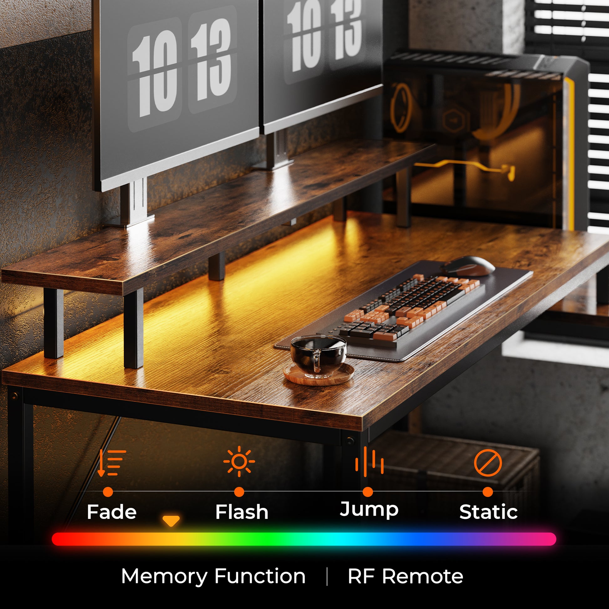 - 【MOOD-LIFTING LED EFFECTS】: Let this gaming desk with led lights create a gaming or home office space infused with colour and life. Use the RF remote to adjust the 22 dynamic modes, 20 changeable colours and 5 brightness levels... Dynamic or static lighting states are flexibly applied to your gaming or working states