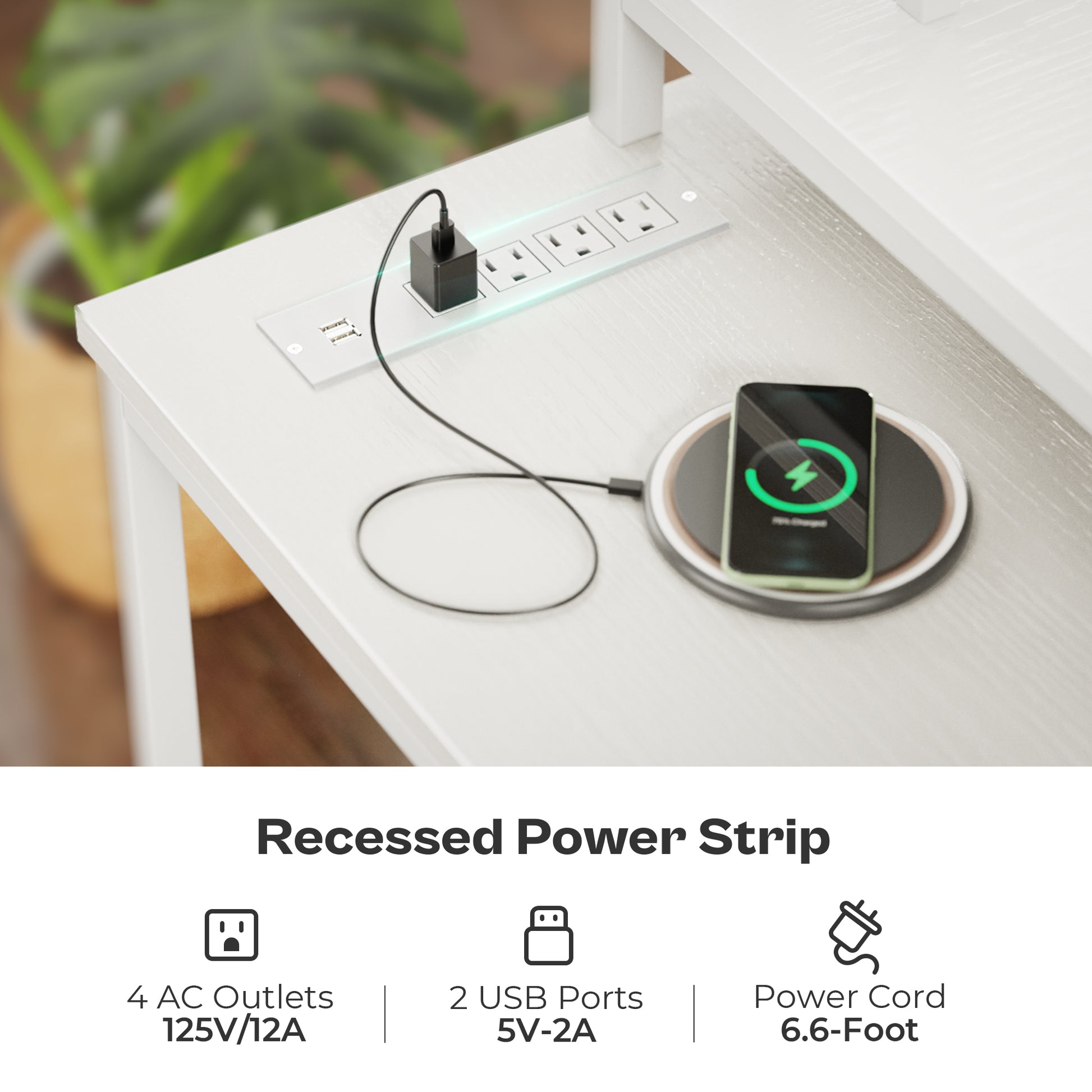 - 【POWER OUTLETS & MONITOR STAND】: 4 AC outlets and 2 USB ports are attached to the desktop of the desk with shelves, allowing you to charge your printer, gaming or office devices close at hand. And it also helps to declutter the messy and tangled wires. The monitor stands on the corner computer desk elevate your lines of eye to a higher level to avoid spine, neck pain whenever working or gaming