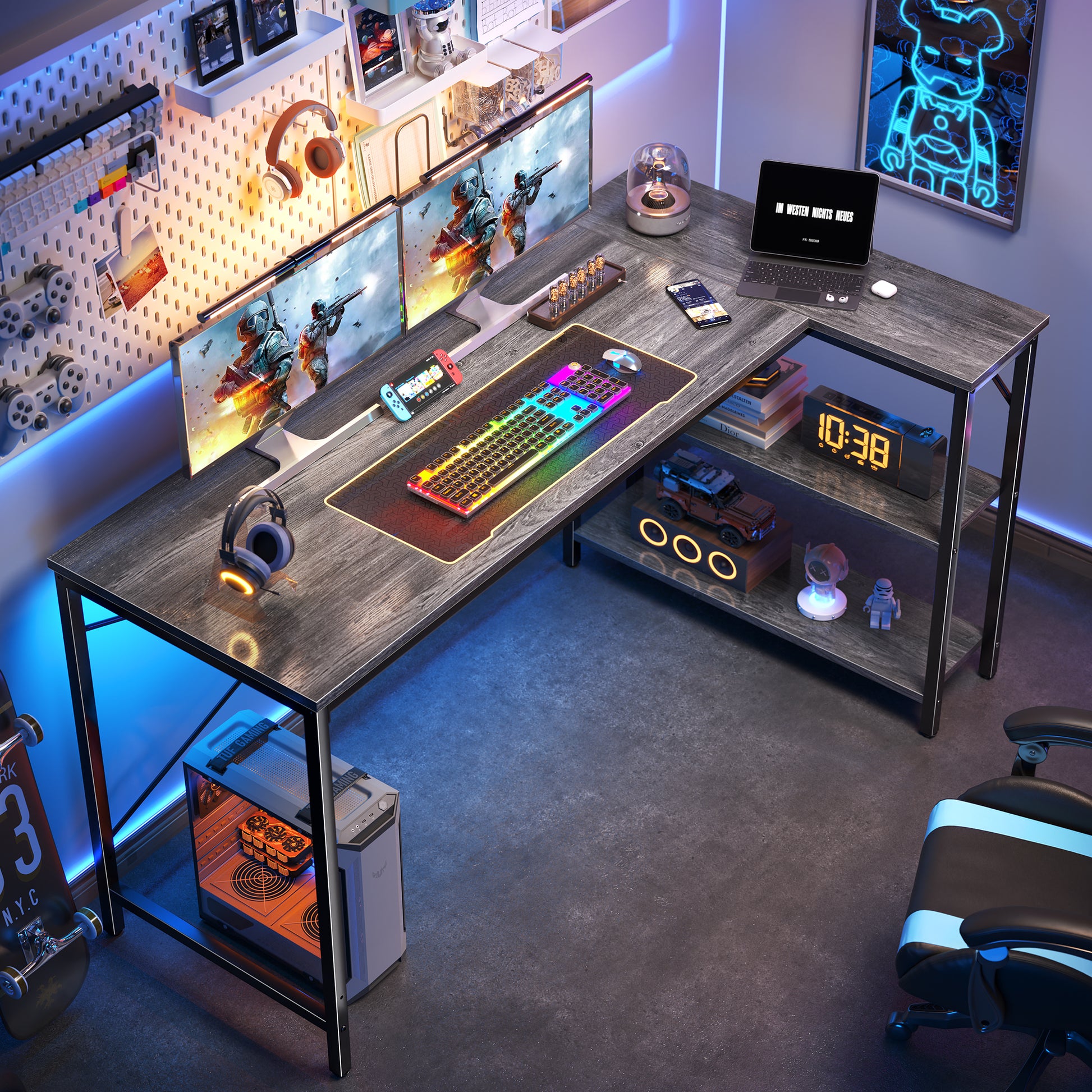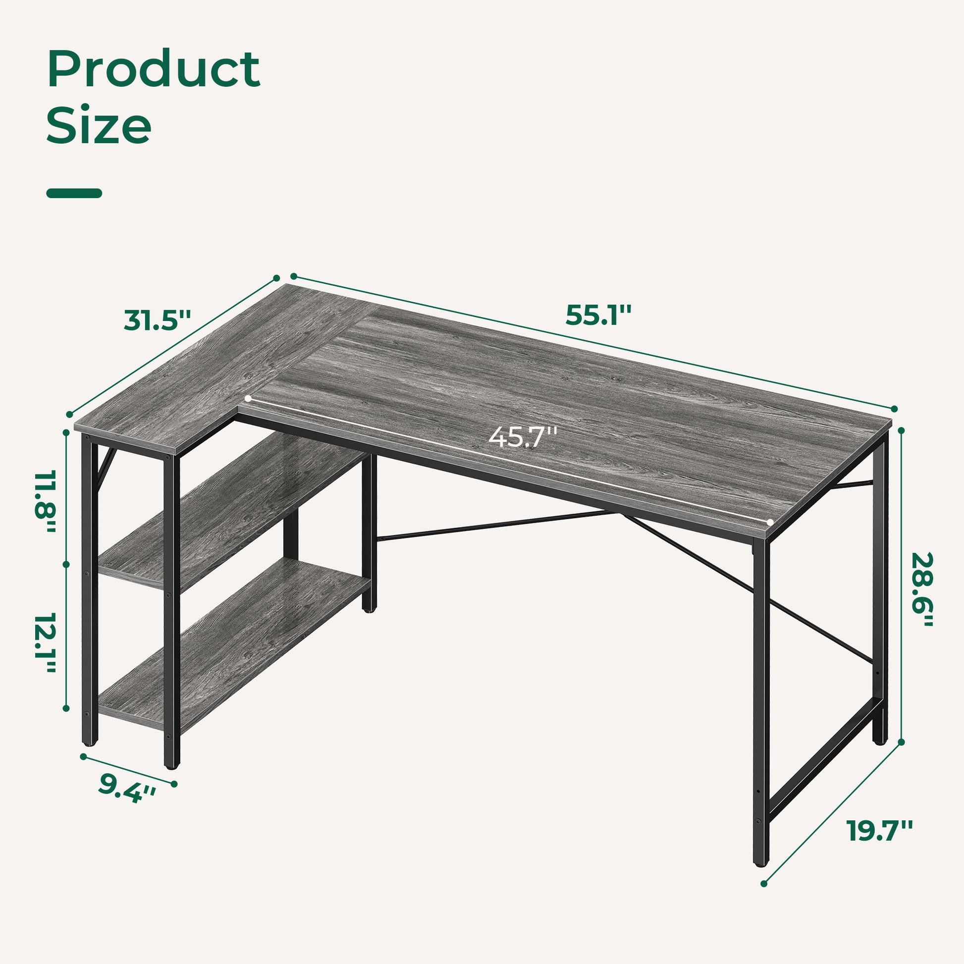 Huuger L Shaped Desk, 55 Inches Computer Desk with Reversible Storage Shelves, for Gaming Corner Home Office Writing Study, Metal Frame, Gray